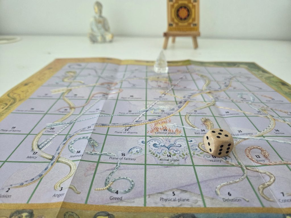 At its heart, the game is simple: you roll the dice, move across the board, and land on different squares — each one reflecting a state of consciousness, a way of being.